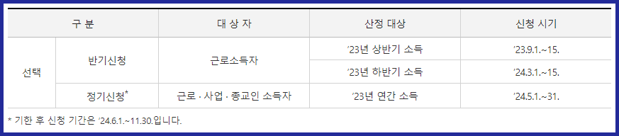 근로 소득만 있는 사람은 반기나 정기 중에 선택하여 신청할 수 있지만, 사업이나 종교 소득이 있는 경우에는 정기적으로 신청해야 합니다.